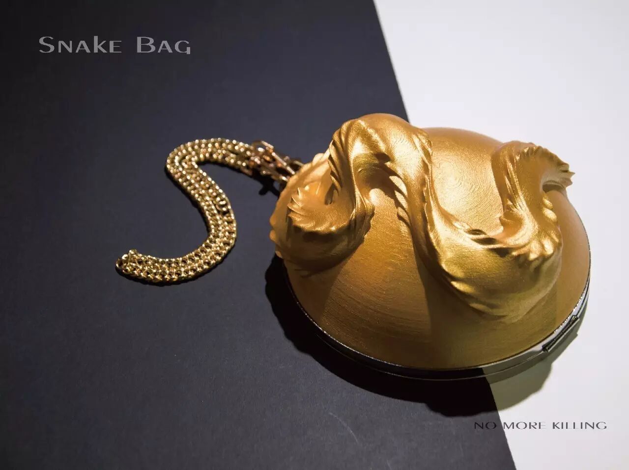 奢侈品的大厦从某种意义上来说,是奢华与罪恶共存。不少奢侈品牌为了制作真皮手包,残害稀有动物获取其表皮。Emma Zhang(张白洁)的首饰毕业设计就以2个手包为主打,用参数化的手段对鳄鱼皮和蛇皮进行模仿与再设计,希望通过技术的语言和设计的力量做出更纯粹、更有创造力的机理,呼吁大家停止杀戮,stop killing,也更加体现了设计的普世价值。
