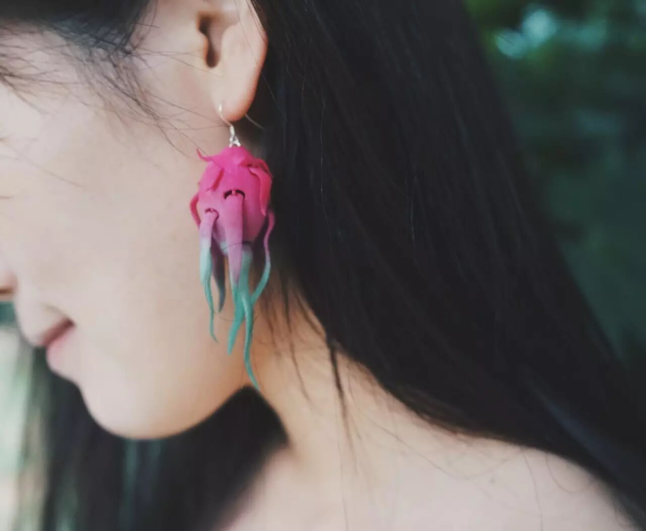 首先用的是超现实的手法赋予每个物像生命力:菠萝的叶子像海边姑娘的头发被风吹拂的飞起,火龙果的茎叶生长、扭动,变成了一种海洋生物,百香果热情的将种子喷射出来...火烈鸟围绕中心开始旋转,开启了一场粉红色的派对;大嘴鸟以相机镜头快门开合的方式舞蹈。每一件首饰都有独特的运动方式,拨动鸟的头部会有相应的互动,水果首饰在佩戴时会各不相同的抖动、扭动。