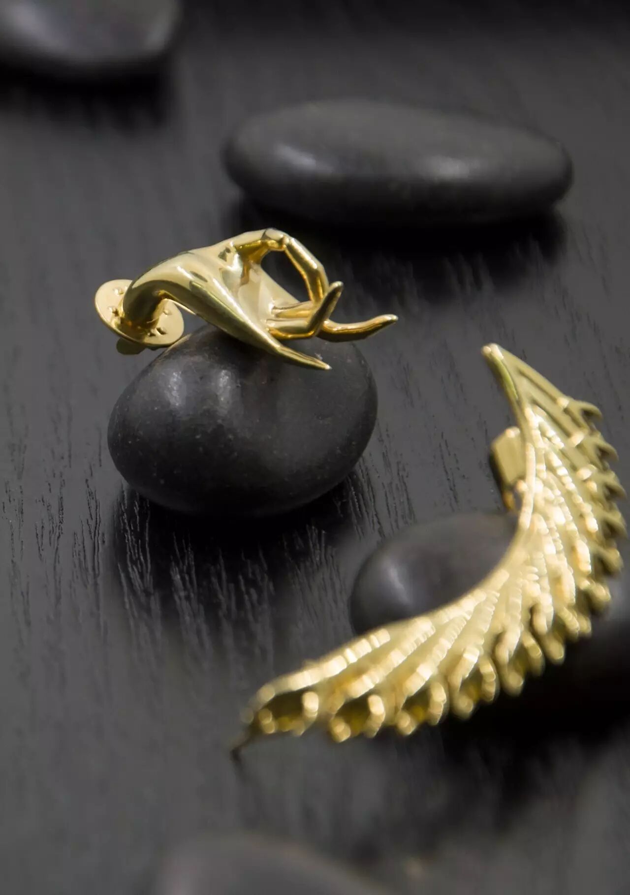 本系列首饰以国博的千手观音像为原型,从观音像扇形展开的千手、及“与愿印”、“皈依印”这两个手印获取灵感,使用动画软件玛雅中的特殊复制、骨骼绑定等技术进行设计,采用传统工艺失蜡铸造,材质为925银镀18k金。全套共有胸针两枚、领针一对,吊坠一件、耳钉一只、耳夹一个。其中,引入了玛雅中Audio Wave技术的吊坠和耳钉可根据用户自己的声音进行定制、让每个人都能看见自己的本音。