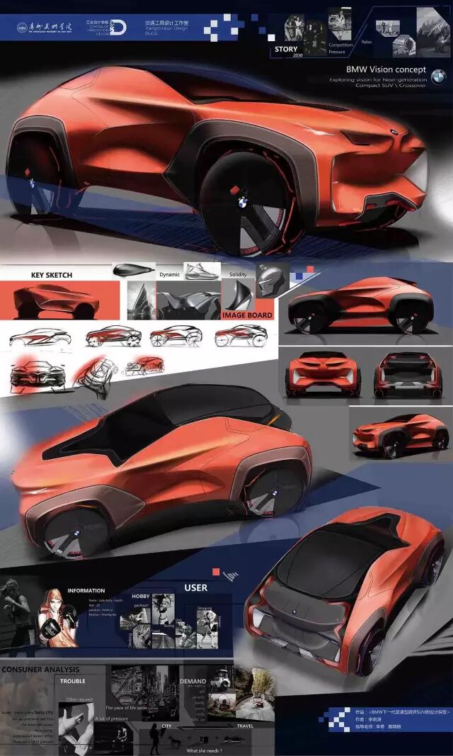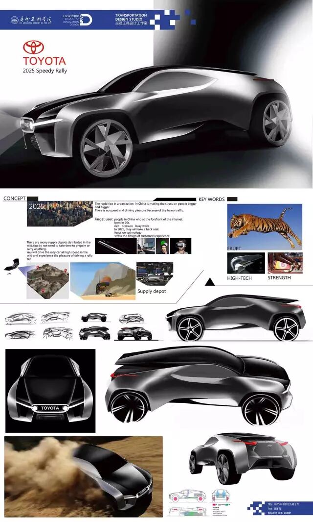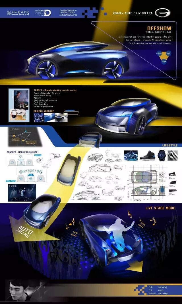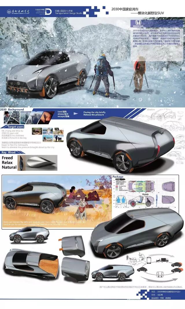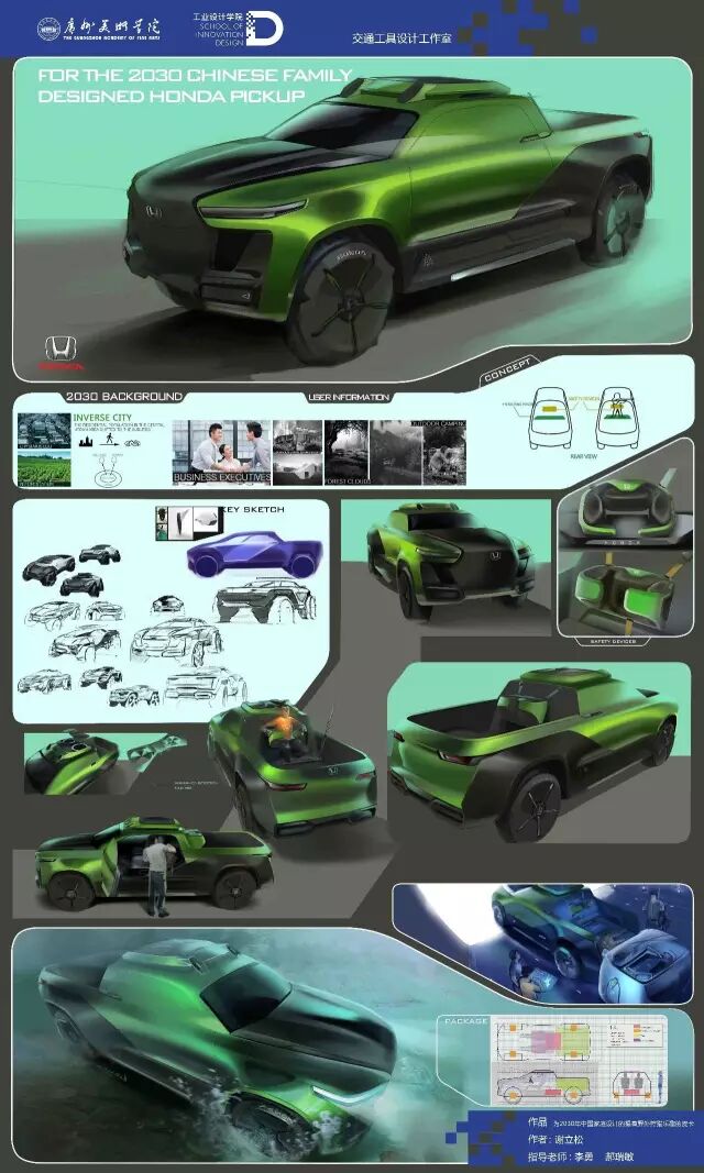 新能源汽车方向主要和广汽、广汽丰田、本田技研等主机厂合作,探讨新能源汽车未来设计发展趋势,并在用户需求细分、使用场景体验、造型风格特征等方面进行了有意义的探索。