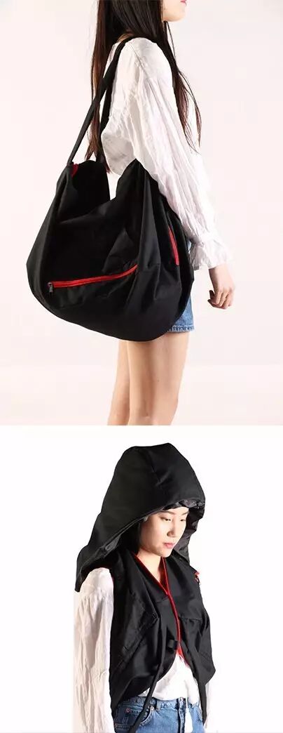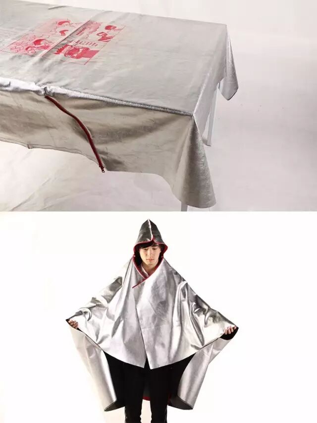 将专用防灾用品日常化。是一种通过巧妙的结构变化,将人们日常使用的桌布、背包、靠枕等生活用品,可以秒变成防火逃生衣的系列设计。