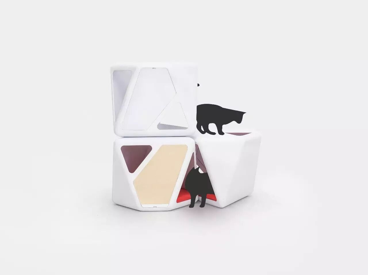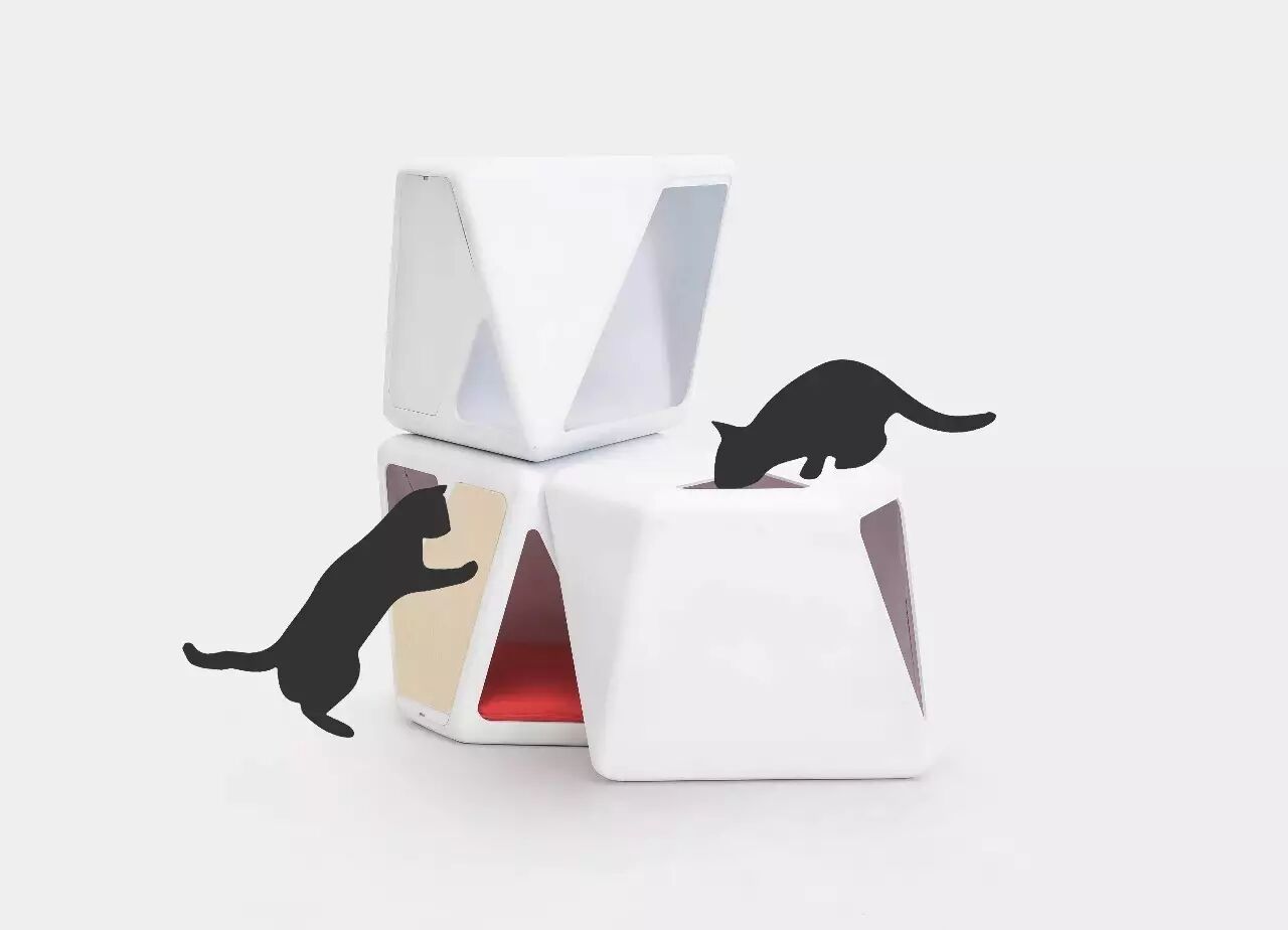 设计说明:现在的铲屎官越来越多了,有的还养了多只猫。基于这样的情况,如何更好让宠物猫用品合理利用空间,我们将模块化的设计理念融入猫窝。使用者可以根据家中猫的数量自行组合。孔位在精心的设计下,当单体的时候,使得猫主人能多个特殊角度观察猫咪以及和猫咪互动。在组合的情况下,这些开孔则使得猫咪能在其中自由穿梭,形成一个类似猫爬架的猫咪娱乐空间。
