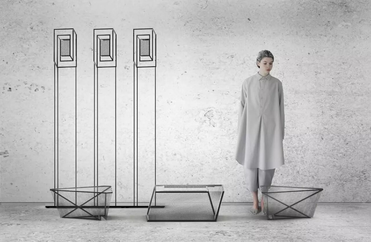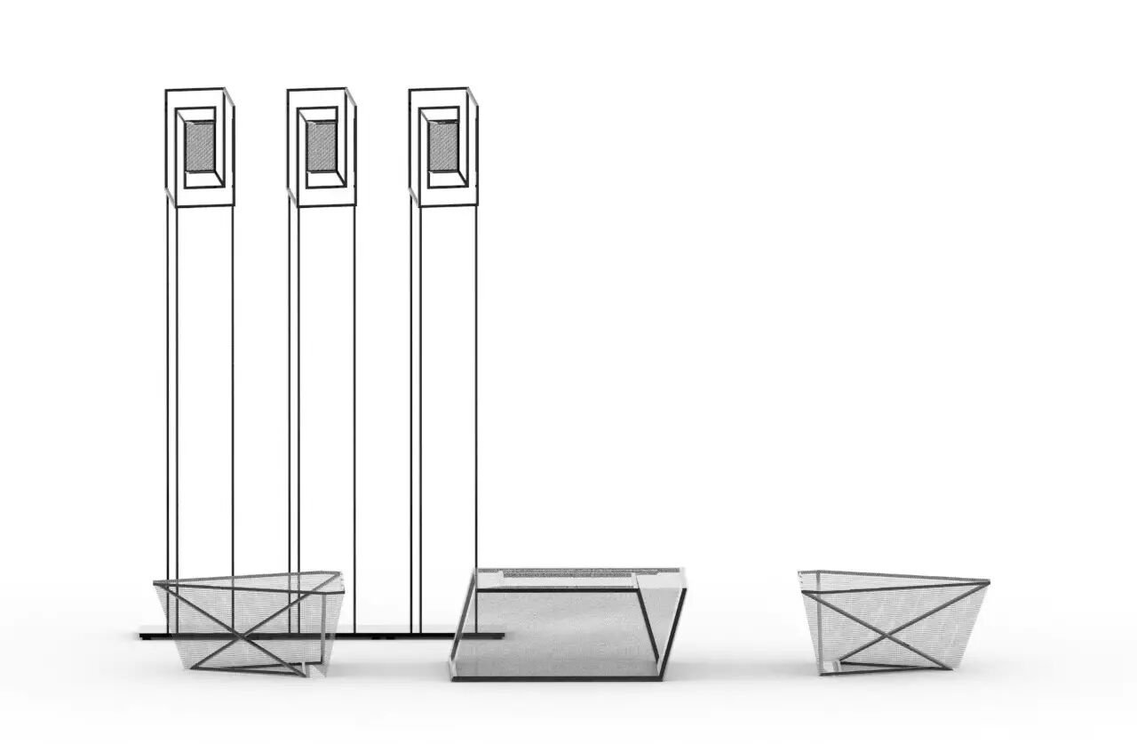 这些不可能图形也赋予了家具造型新的形式感与造型语言。在材质上我们选用了金属圆管与金属网,营造出简洁、多变的视觉效果。