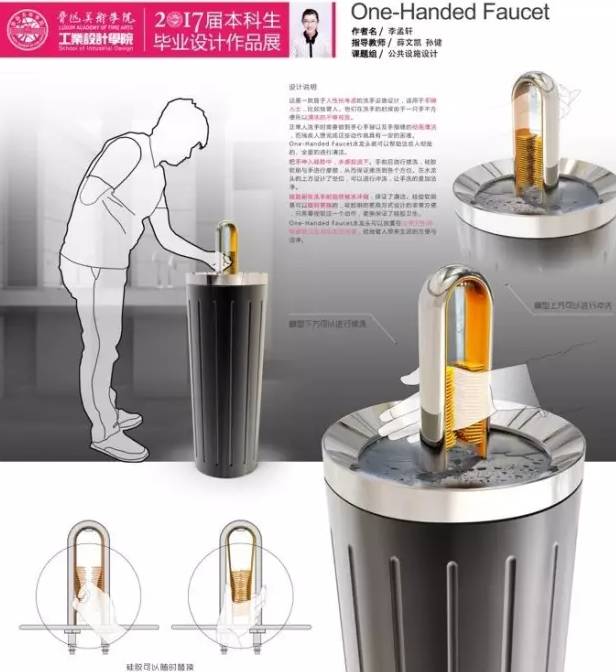 工业产品首要解决的便是功能性,这个One_Handed Faucet水龙头,以实际情景出发,解决现实存在的独臂人在公共场合不方便洗手的尴尬问题。
