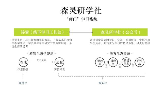 我们借鉴了古时候的师徒教学,把“森灵研学社”,变成一个以师门系统为核心的教育系统,加强科学家(师父)与学生(弟子)间的联系;把从认识、学习植物到创作精灵的过程,称为“召唤”,成功“召唤”出精灵的弟子,我们给予“召唤师”的称号。