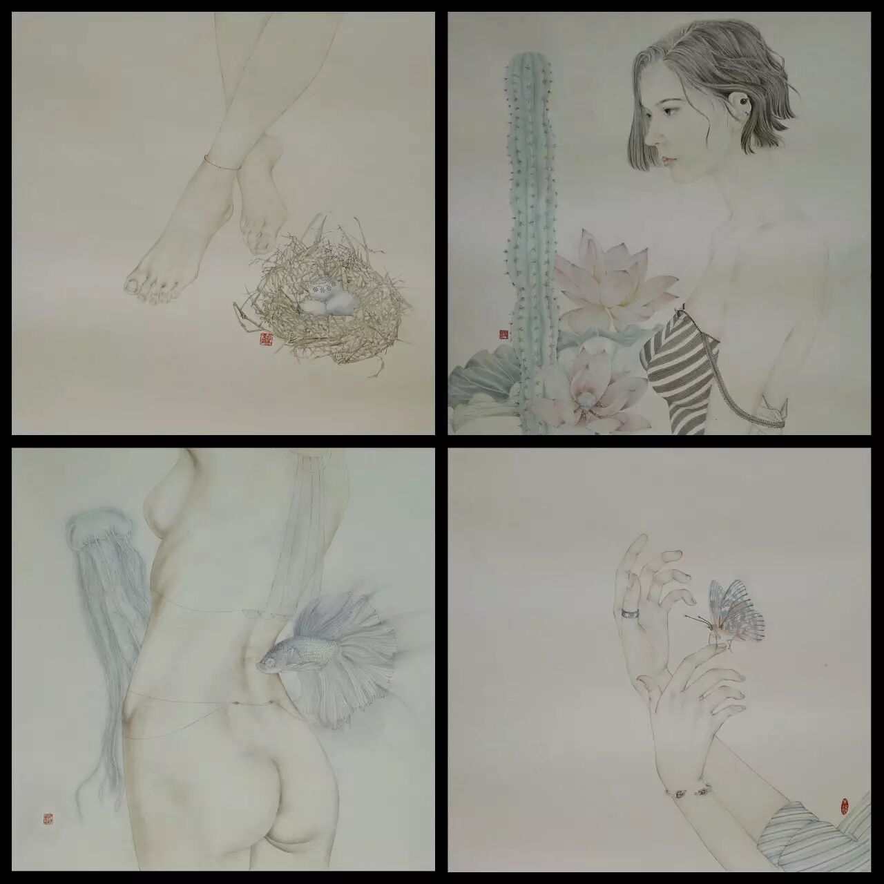 余悦闻 《闻香》,纸本设色,70×70cm×4