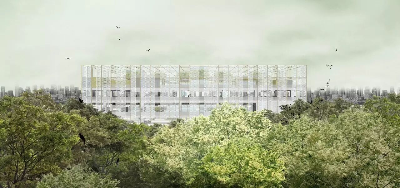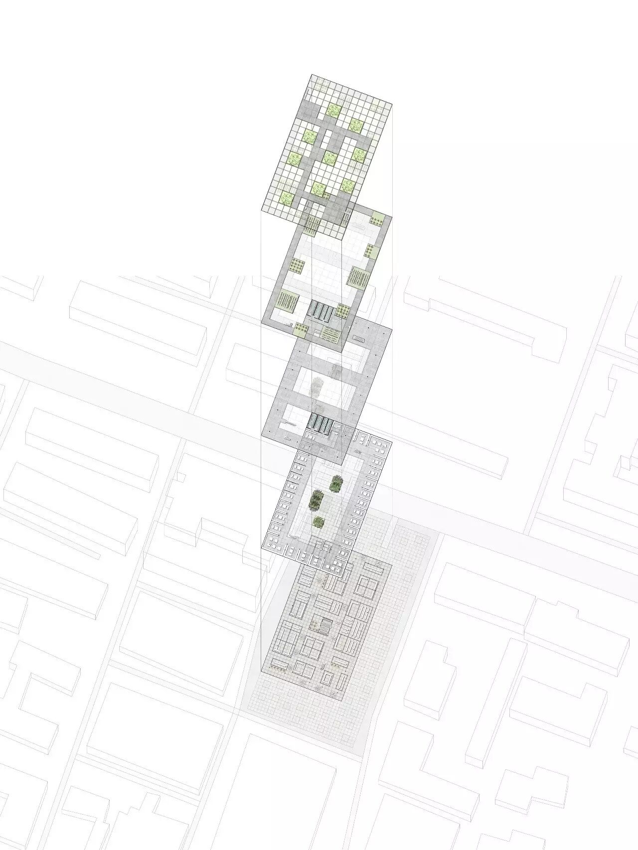 对许多人来说,传统菜市场记录着一种生活方式,承载着几代人的记忆,象征着老百姓的市井文化。回归“最初的喧嚣”,重新构建菜市场的空间原则以唤醒菜市场作为城市文化载体的“社交属性”。基于此概念提取以下关键词作为设计元素的提示:嵌入式的、可组合的、多维的、通透的。因此,采用了具有模数的框架作为空间结构。在建筑室外景观上也沿用了框架的模数化元素,意在创造一个可变的多元空间,也希望不要让室内外的界限过于刻板。