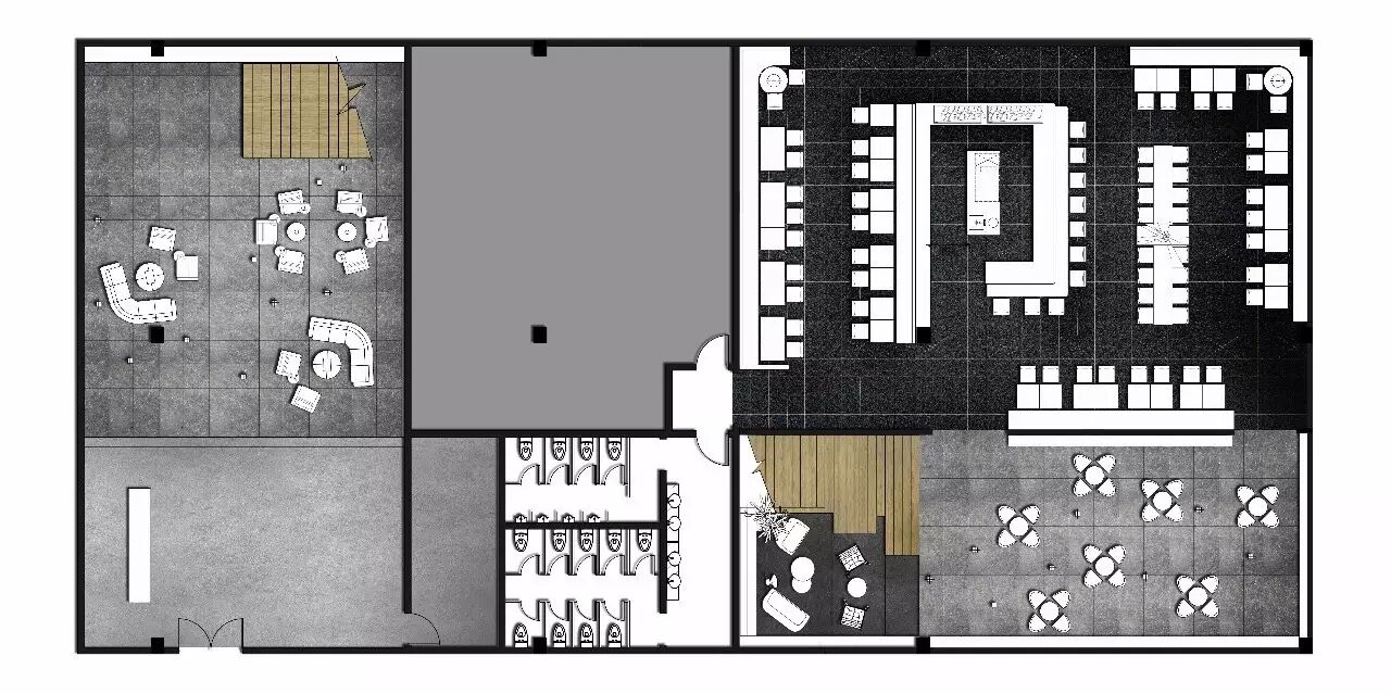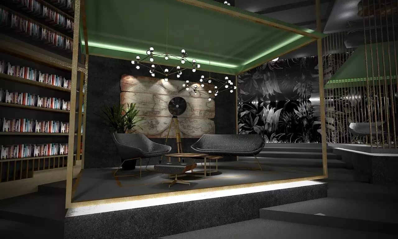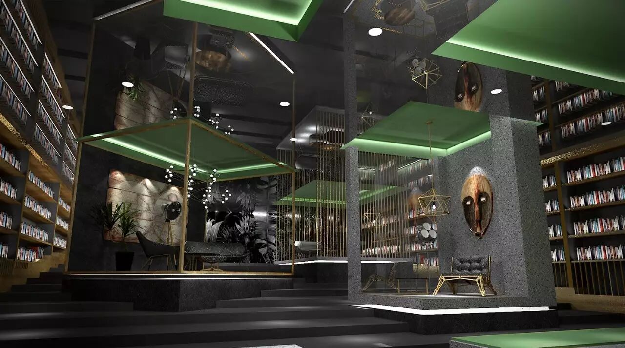 空间营造是第三空间餐饮综合体的“皮囊”,作为基于体验式服务的设计方案,本设计基于图书售卖阅读空间和餐饮空间的业态融合,在空间意向上想营造出一种犹如书籍森林知识秘境的空间。相较于浮于表面的直接对意向转化的方法,案例充分解构,整个空间由简化而成的树干的形态——钢木混合木方,和遮天蔽日的绿色树荫——顶部的绿色箱型空间两个部分来塑造场景。