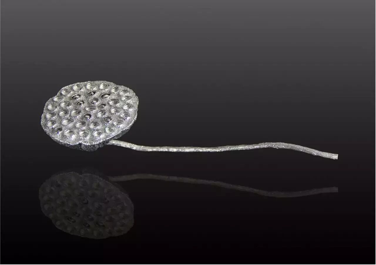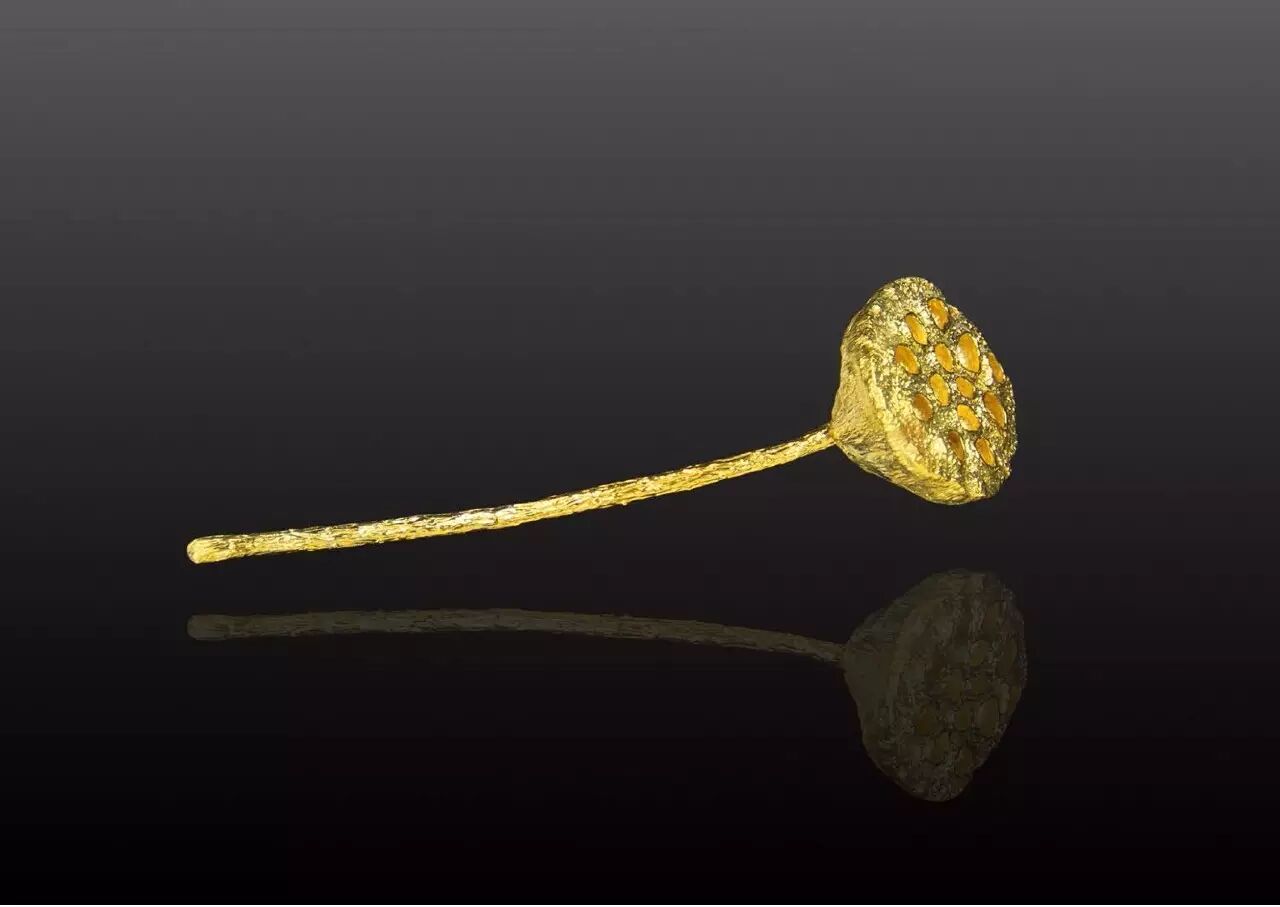 《荷韵》——把植物“建筑”当中的莲蓬,即这个生命体孕育繁衍的根本进行了微塑的设计,最后采用蜡材雕塑翻模成型。这种物态化的形式,让人们对大自然的孕育之美也有了更深刻的认识与永久的定格,从而愈发感悟生活,敬畏生命。