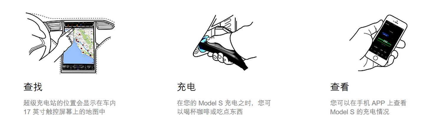 Tesla超级充电站号称世界上最快的充电站。超级充电站可免费使用,为 Model S 充电仅需几十分钟,不用花费几小时。充电站通常建在饭店、购物中心以及 WiFi 热点网络附近,非常方便。每座超级充电站均安装多台充电桩,可同时为多辆 Model S 充电。而最近Tesla扩张计划也将采用目的地充电的方式。