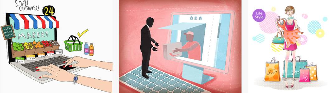 推荐关键词:商店、试衣、购物车、购物袋、双11、双12、618、快递、包装、打折促销等。