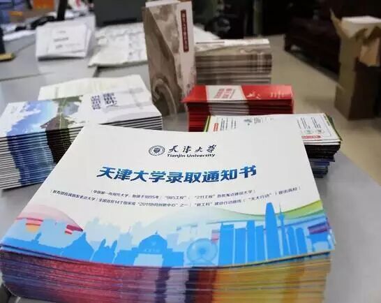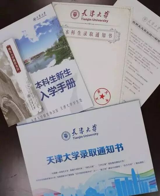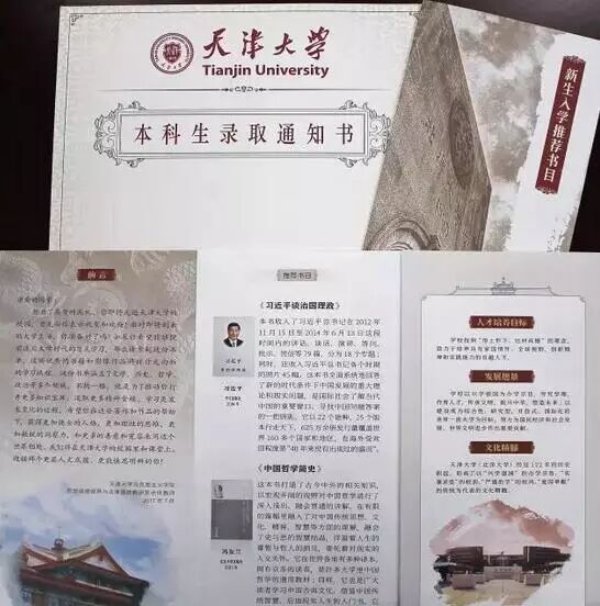 天津大学高考录取通知书在设计上融入了天津大学校徽、学校标志性建筑“北洋大学堂”等元素,突出学校深厚的历史底蕴和浓厚的人文气息;全新的快递封套,清晰醒目的标注了“天津大学录取通知书”字样,并以剪影元素呈现出了天大和天津特色。随录取通知书一同寄出的还有一份来自天津大学精心准备 “新生入学推荐书目”,该书目包括《习近平谈治国理政》、《中国哲学简史》、《平凡的世界》、《苦难辉煌》、《中国震撼三部曲》、《如何阅读一本书》六本书籍和《大国工匠》、《国家相册》、《航拍中国》三部影像作品,涵盖了文学、历史、哲学、政治等多个领域,希望同学们在这些著作和作品的帮助下,获得更加健全的人格,更加理性的思维,更加敏锐的洞察力,以更多的善意和宽容开启崭新的大学生活。