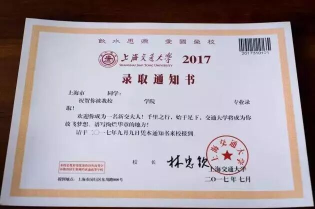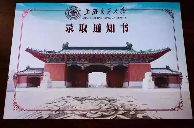 上海交通大学 上海交通大学2017年录取通知书正面以“紫气东来门”为背景,镶嵌“交通大学”四个字的门匾熠熠生辉,大门后方是以上海交通大学创始人盛宣怀命名的“宣怀大道”,象征着巍巍百年学府张臂拥抱来自五湖四海的莘莘学子。在录取通知书的反面,不仅有校训、校徽,还印写着“千里之行,始于足下,交通大学将成为你放飞梦想,谱写绚烂华章的地方”。