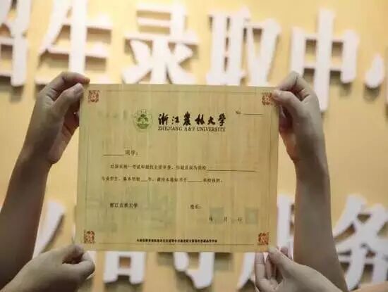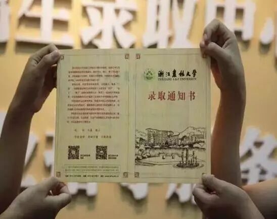 浙江农林大学 浙江农林大学录取通知书是用毛竹做的!这些毛竹用该校自主研发的刨切微薄竹技术制作而成,像纸张一样轻薄、可折叠,毛竹的录取通知书,不仅典雅美观,还有一种穿越回竹简时代的古韵。这些录取通知书运用刨切微薄竹技术制作并印刷而成,相关技术曾获国家技术发明奖二等奖,刨切微薄竹制造技术是由浙江农林大学自主研发的、拥有自主知识产权的竹材精深加工新技术,先后获得近8项国家专利。今年是该校第三次向新生寄发毛竹录取通知书。它们在防腐、抗压方面都有了全面升级。