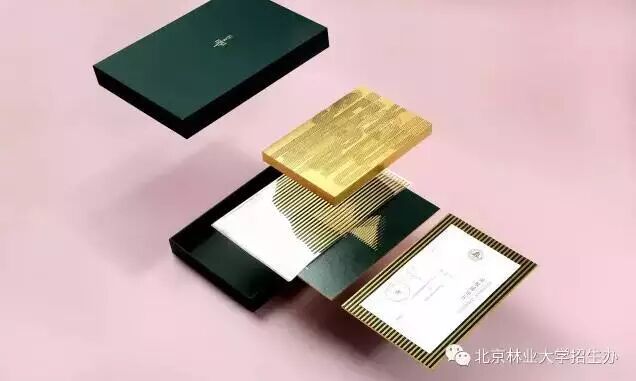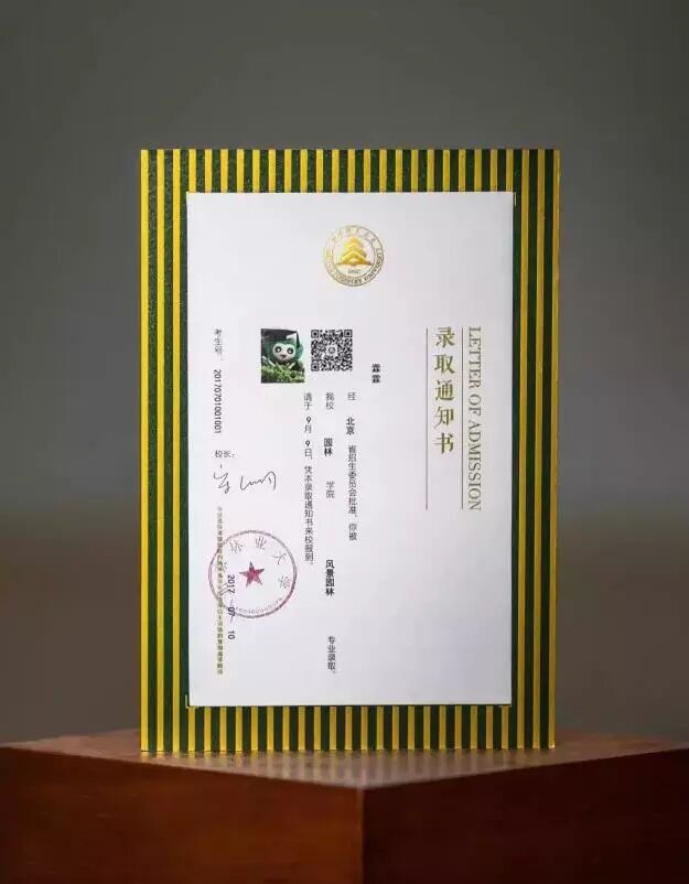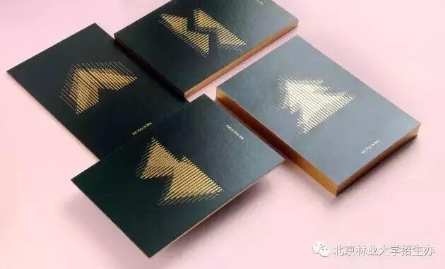 北京林业大学 录取通知书的主图案是从校徽中提取的三角形元素来表现山、水、木、人的抽象图形,山之坚毅,水之柔韧、木之繁茂、人之活力,这是北林的精神,是每一名新绿即将浸染的绿色印记,而且四个图案是随机的。通知书内页采用120克意大利刚古纸,纸张暗纹触感明显,经烫金,模切而成;封套采用14丝PVC进口材料,大面积烫金,塑压、模切成形。礼盒在专用板材基础上对裱157克太空梭光铜,覆意大利进口触感膜,全自动开槽机开槽贴裱,盒面图案烫亚金。