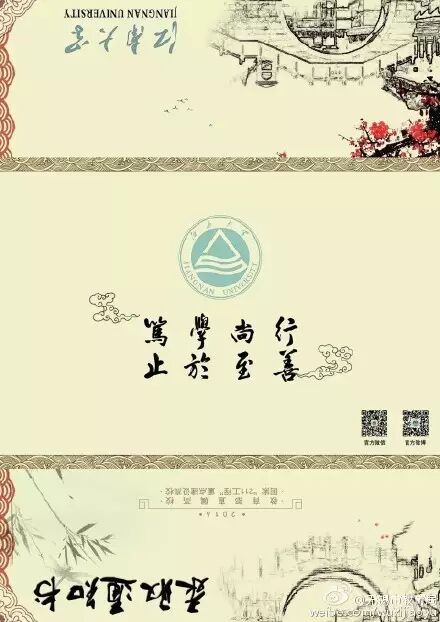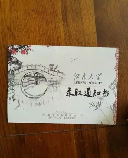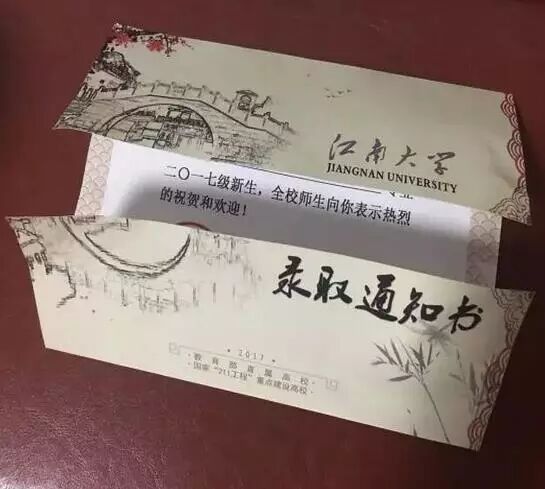 江南大学 江南大学2017年录取通知书以“水墨江南”为主题进行设计。外页图形采用了“清名桥·墨梅”等元素拼合。墨梅寓意着“梅花香自苦寒来”,表达了对历经寒窗苦读的高考学子的赞誉;内页采用了“云纹·水纹·白描江南大学图书馆·莲花·墨山”等元素拼合。通知书打开的动作与清名桥在水中的倒影巧妙结合,交互得趣味横生。