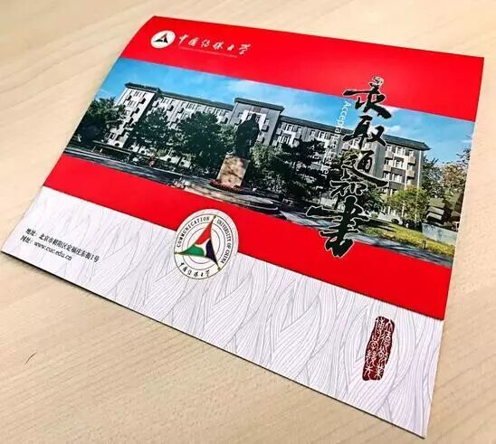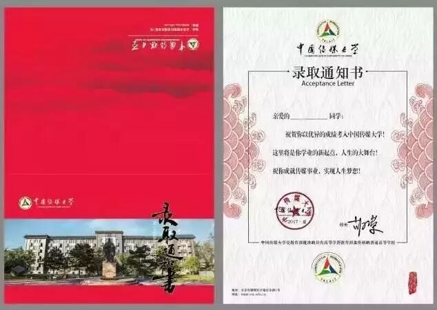 中国传媒大学 中国传媒大学2017年录取通知书正面是立德楼,楼前伫立着至圣孔子的雕像。封底是山岳的形象——日星隐曜,山岳潜形。内页以凝聚向上的线条为底纹,像生命的力量朝着梦想的方向成长,以云海纹为装饰,庄重典雅。正如《录取通知书》中言,“这里将是你学业的新起点,人生的大舞台。祝你成就传媒事业,实现人生梦想。”