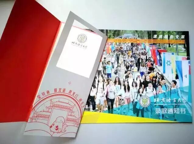 北京语言大学 北京语言大学2017年录取通知书两分式的装帧取“云开方见日”的寓意。外封选取橙色作为主色调,代表着北语对新学子大学生活的美好祝愿,成为欢快活泼如橙色般温暖的人,而浅色的底纹则代表了象牙塔的纯洁与学术的清净。外封三折页中采用了镂空元素,镂空下面则是北语招生吉祥物——宝贝鱼鱼跃龙门的图案,代表着考生从中学进入大学完成了一个质的飞跃。内页采用了洒金特种纸,同正红色的背面组合起来,彰显庄重与正式。内页的古典刚朴与外封的现代活泼相映成趣,这也体现了北语兼收并蓄,中外共同发展的校园文化。