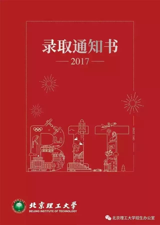 北京理工大学2017年录取通知书封面设计大写的“BIT”(北理工英文名简称),具有很强的视觉冲击力;它融入了中关村校区学校主楼、良乡校区徐特立图书馆、北湖中戏水的黑天鹅、校园装甲车等标志性建筑和风景元素;还融入了中国第一架空警2000预警机、“神舟”“天宫”飞船对接、“北斗”卫星发射等北理工为国家做出卓越贡献的科技元素,展现出北理工雄厚科研实力与优美校园环境的和谐统一。为表达北京理工大学对人才培养的高度重视,校长胡海岩院士现场为待录取的各省份文、理科最高分考生亲手签发录取通知书