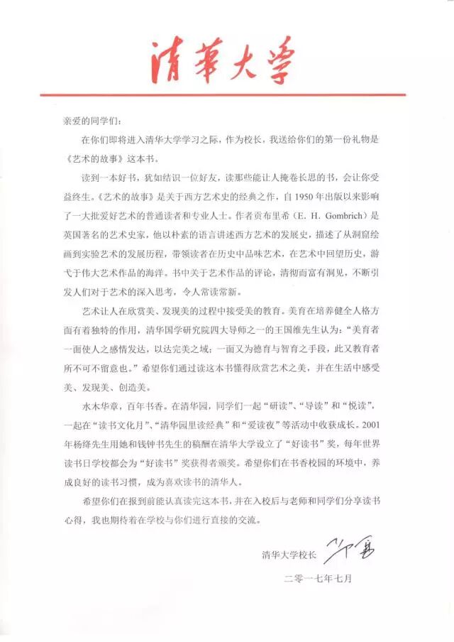 清华大学 清华大学发出的录取通知书,除了入学材料,还会寄去一本书,这已成为清华大学的传统。去年和前年,清华大学分别选择了《瓦尔登湖》和《平凡的世界》,今年寄出的则是《艺术的故事》。不同于《平凡的世界》引导学生关注现实勇担责任、《瓦尔登湖》勉励学生感受内心宁静的巨大力量,今年,这份特殊的礼物改走“艺术范儿”。该校校长邱勇寄语学子,“通过读这本书懂得欣赏艺术之美,并在生活中感受美、发现美、创造美”。
