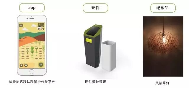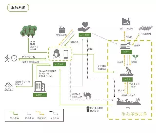 沙漠植树公益类型的服务设计,平衡项目流程中社会公众、公益组织、企业、牧民、合作社利益相关者的活动流程设计,核心点是公众从捐赠的行为转变为认领管护梭梭树的行为,以期达到项目的可持续性发展,同时对服务流程中涉及到的触点如管护硬件、特色纪念品、移动端应用进行设计。