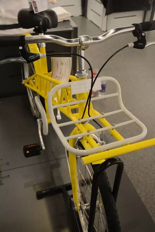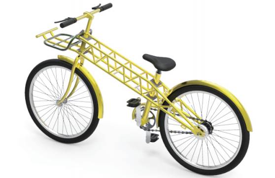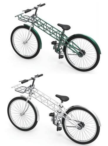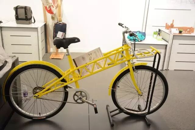本产品是根据建筑中的钢架结构来设计的,把塔吊和钢架的结构运用到自行车中,增加了产品的置物功能,在一定程度上更加方便了人们的出行;从外观来看,这种钢架结构运用到自行车中,让产品更加具有独特性,一种更加新颖的表现方式,使自行车更加有观赏性,再加上明亮的配色,让整个产品更加具有视觉冲击力。