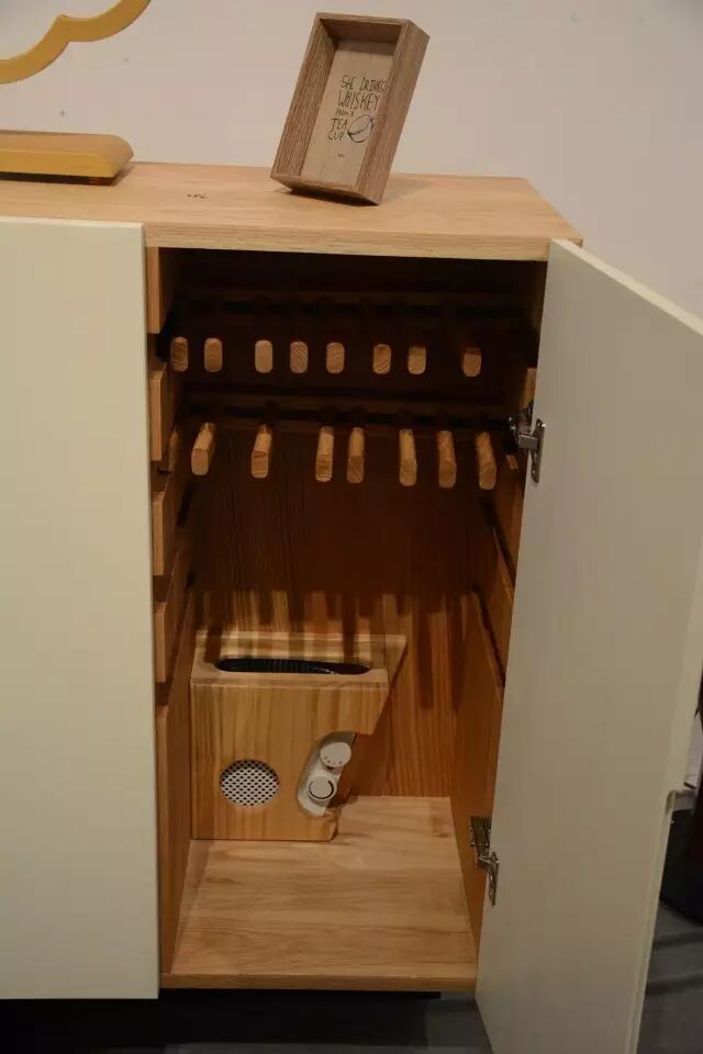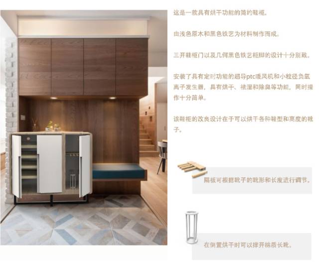 这个烘干鞋柜的设计是为了简化市面上的智能烘干鞋柜繁复的功能,以及优化现有鞋柜在靴子摆放方面的缺失。柜体由原木制作而成,柜门材料是白色纤维板,柜脚为黑色钢铁。它的设计点在于内置型烘干机,可以选择工作时间和干燥力度;右侧可用于摆放靴子,可以根据靴子的长度和宽度对隔板进行调节。