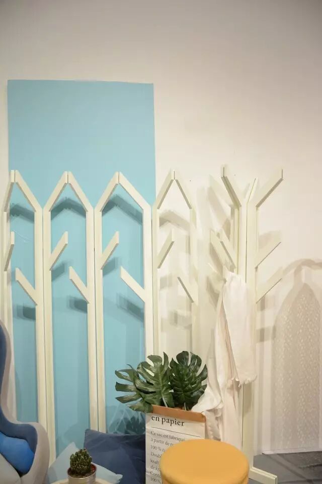 多一克的灵感来源于好妹妹的一首歌,为了用家具解决小空间问题,我进行了三件家具的设计:1.可以当作屏风隔断的衣架。运用了树的形态组成一个模块化的设计,通过合页进行旋转,把它变成一个独立的衣架。2.一物两用的马卡龙边几凳;3.自带置物架的模块化曲线形沙发(特殊原因,无实物展出)。