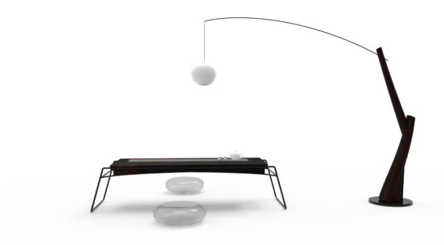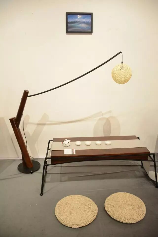 “单钓”由茶几和落地吊灯组成,均由铁艺和木艺结合而成。首先落地吊灯的底盘是一个圆形的铁盘固定木料立柱,立柱分两部分由两根木块拼凑而成,在上方木块的顶端插入一根铁棒类似于鱼竿的方式,吊灯挂在顶端垂下,类似于鱼线的方式,灯线可以由铁棒引导向下落到地面插座。第二部分是茶几由桌面和铁架组成,桌面可以直接落到铁架顶部由四个节点四面接触面支撑整个茶几面,其中茶几面底面造型仿照桥面的形状。适用于家庭休闲使用,两人席地而坐面对面在茶几两边饮茶。