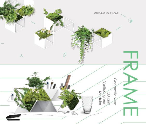 作品类型为定制化墙体与桌面装饰盆栽,是基于3d打印技术的一系列绿色种植产品,设计目的是为了探索技术与产品创新之间的链带关系,在注重产品形态与功能的同时,对产品材料、制造技术都融入环保的设计理念和可持续发展的思想。以满足家庭绿色种植体验的需求为目标,结合3D打印技术,将绿色种植产品个性化、定制化、便捷化、系统化、商业化。