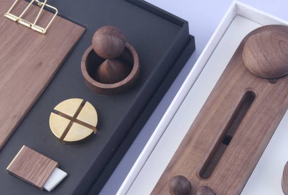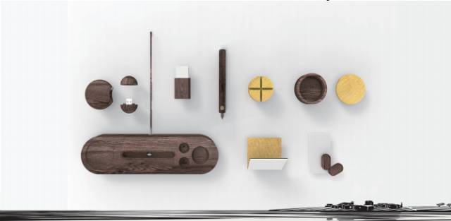 本次办公文具的选定范围为传统书写工具和纸镇等,还有放置手机以及能为手机充电的笔座、U盘、名片座等。产品设计结构上是从一块完整木头上提取了所需要产品各部分的材料。在制作成产品后还能非常完整的放置于一起,便于收纳。和黄铜结合增加产品的耐用性和品质感。