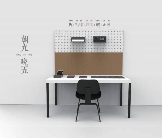 “朝九晚五”以“折”为初衷进行“灯、钟、架、袋”的延展。以毛毡为战袍,软木为配饰,磁吸为内里,无线充电技术入股,希望产品能够不论以组合的或着个体的形式都能延展出更多的可能性。