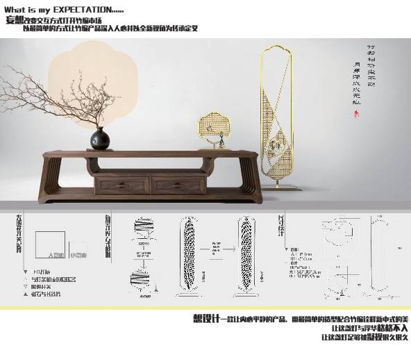 这个作品让人们用最直观的方式了解竹编,并融入新型的开关交互方式,让竹编灯具脱离以往沉默单调的层面,以新的形势引发用户对竹编灯具的喜爱,并以发展的眼光了解竹编热爱竹编。从根本处改变人们在提及竹编传承时那种不否认也不积极响应的冷漠态度。