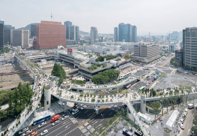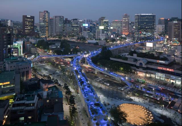 首尔空中花园选址在一座横跨全城的高架桥,将这座原先车来车往、高踞于地面之上的混凝土巨构调整到宜人的尺度,使行人来往穿梭,让本地植物品种在此繁衍,高架桥重新归于人和大自然,成为都市人相遇、休憩、漫步的所在,增进了桥、人与这片区域的感情。该项目将这片原本破碎的地区重新连在一起,让城市空间重新打开,唤起了首尔市民的集体身份认同。