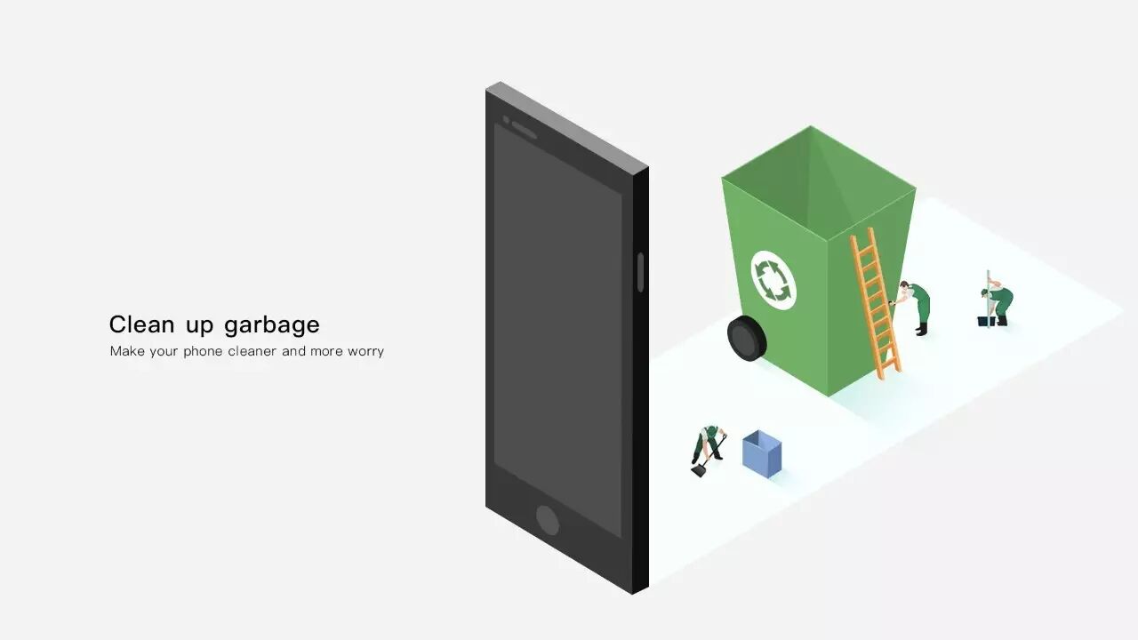 前几天工作上有一个任务,想表达手机黑屏时自动清理垃圾这样一个概念,由于整体风格已经定下是偏科技感的,所以不适用卡通风格,但我自己很想尝试用自己的想法来表现,于是就自己私下做了一稿(还可优化),如下图: