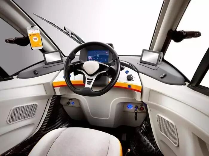 Lutz Pathfinder 为典型的一厢车,只能搭载两名乘客,最高时速为15mph,续航时间约为8小时。牛津大学 Mobile Robotics Group 研究团队为无人车设计了全方位的图像捕捉系统,包括有22个传感器、激光成像部件、全景照相机和雷达定位系统。