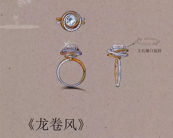 评委点评:该作品在两方面值得欣赏。一是材质搭配上用双色金组合,视觉效果很丰富,尤其是在K白的部分镶嵌了小钻,增添了视觉美感和节奏感;二是在造型形态上,侧面的线条穿插组合,呈现出了龙卷风的动感,通过形式对比,静中有动,很精准地诠释了龙卷风的概念。