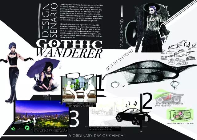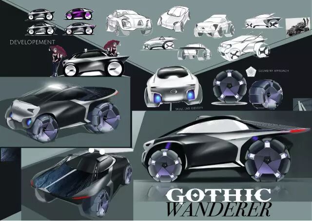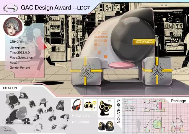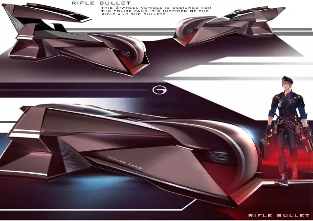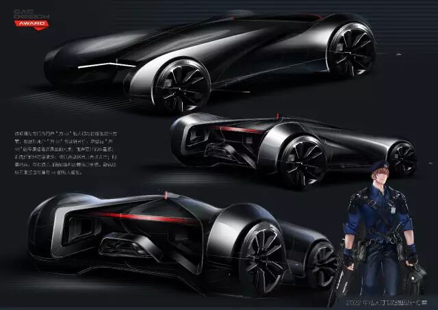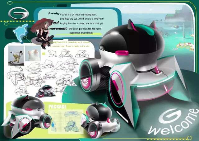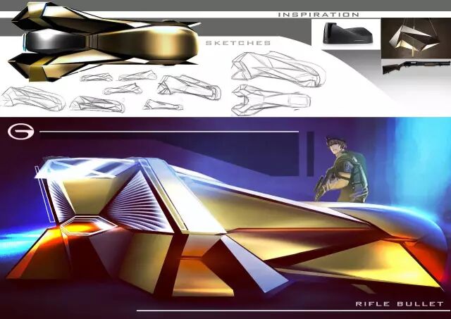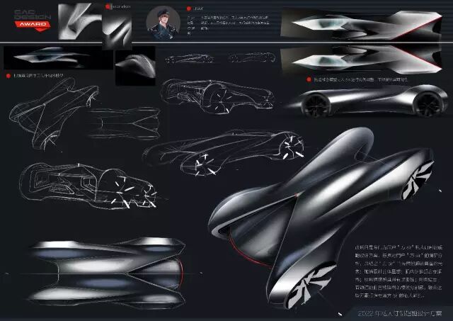评委点评:“既轻量化又运动的造型语言,草图和渲染图展示了统一的形式感,需要加强和角色之间的关联度。”