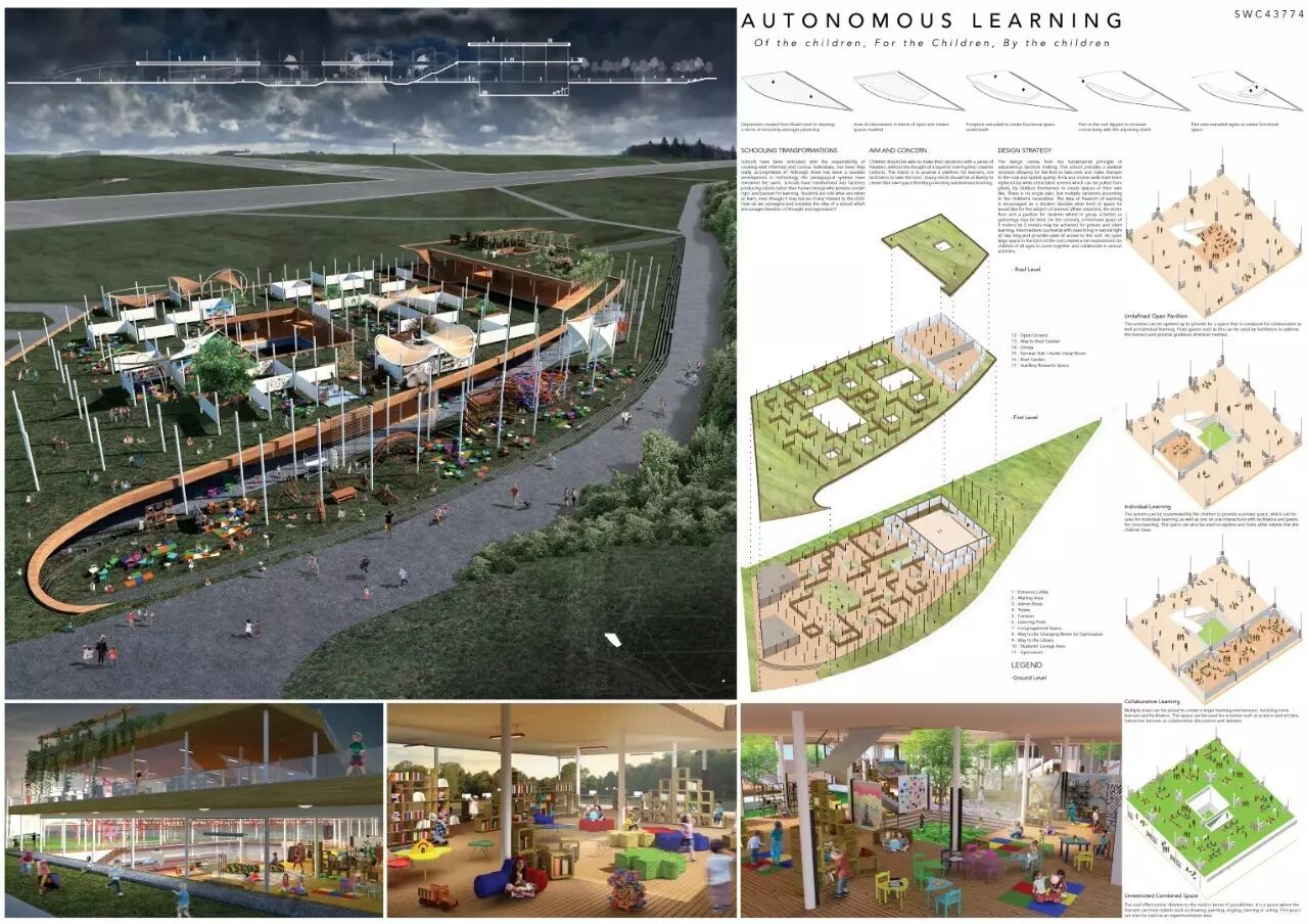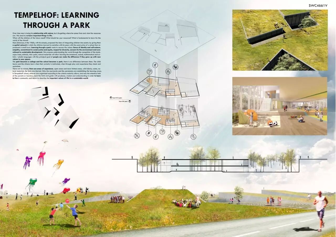 由印度的设计竞赛机构Archasm在今年4月份发起的一项概念竞赛“无教室学校”设计竞赛,选择了位于柏林的Templehof作为设计场地,竞赛重新审视传统的教学方式和教学理念,提出了建立一个完全否定现代“桌子黑板”教学理念和正规化建筑类型的中学(5-12岁)的概念,打破所有的实体的和隐含的课堂划分,使其融成一个全新的学校体系。