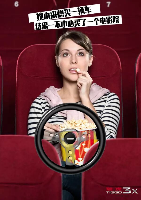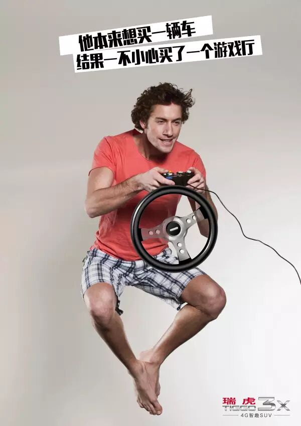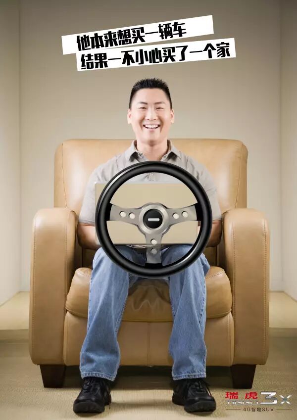 根据产品“4G智趣SUV”的定位,夸张表现奇瑞瑞虎3X“玩的转”——整车覆盖全时4GWiFi,走到哪,热点就跟到你哪,看电影,玩游戏等统统满足你。“买了一个家”则表现产品的舒适度。