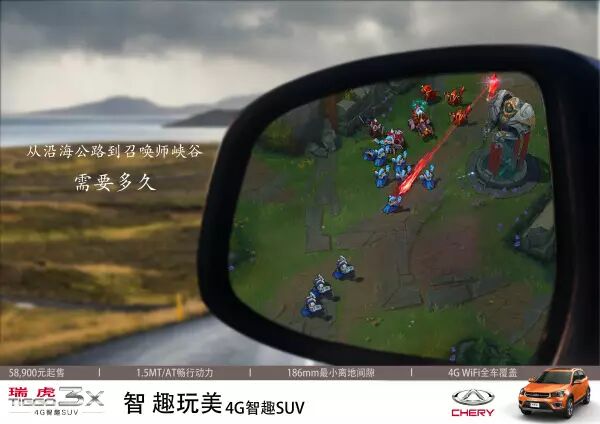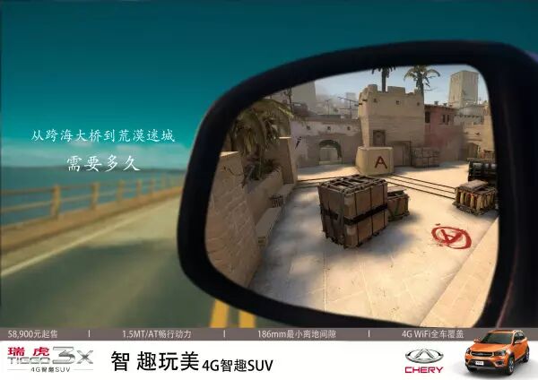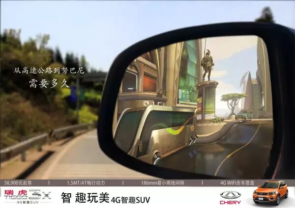 行驶在不同道路上的瑞虎3X,后视镜里反应的是各色竞技游戏。体现瑞虎3X智趣玩美的主题。