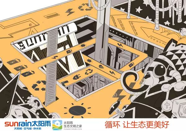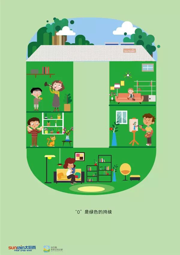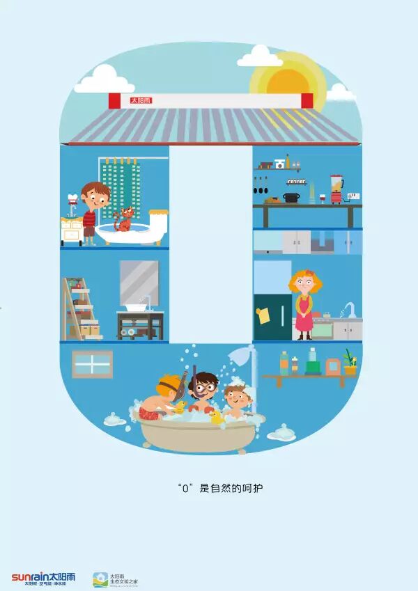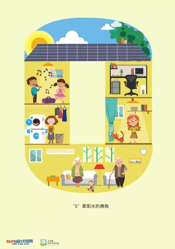 创意思想:以0能耗、0污染、0排放为依据,结合太阳雨集团“生态文明之家”的理念,从0这个数字开始发散,并将产品以屋顶的形式融入;从logo中提取出黄、绿、蓝三色为每幅场景的主色调,分别象征阳光、能量、纯净,展现出三幅人们在太阳雨产品的呵护下的幸福生活场景。