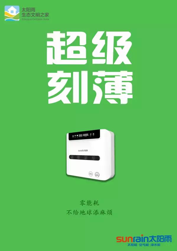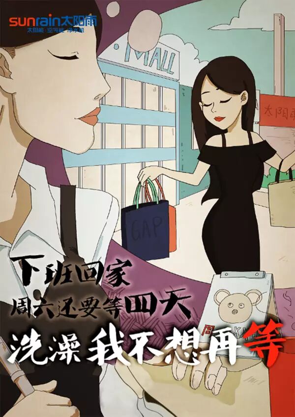 创意思想:跟上城市的节奏,赶上时代的步伐,首选的是一个“快”字。每当下班的回家,都希望能洗个热水澡。是太阳雨给了我们舒适,无需等待,一秒出热水,这才是太阳雨赋予人类的爱。