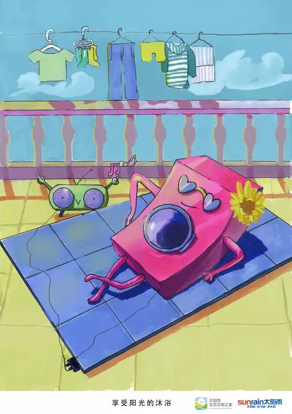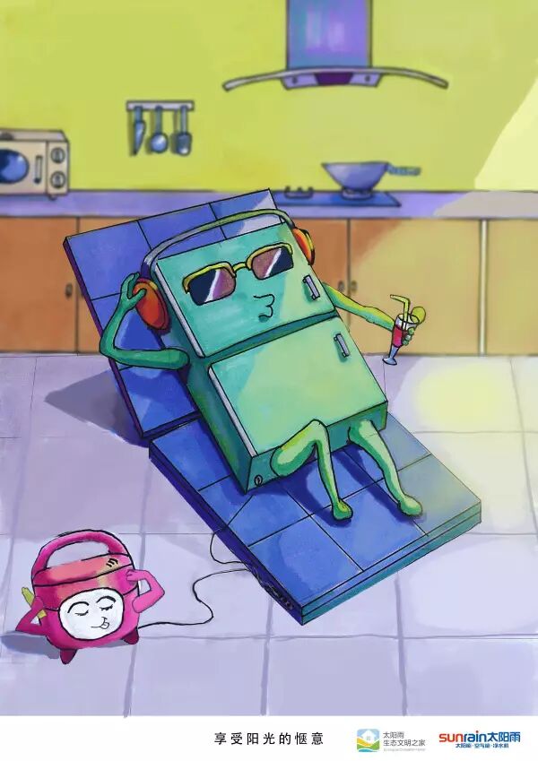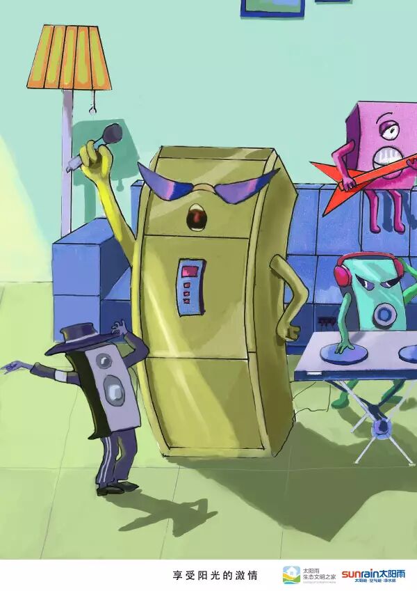 创意思想:利用绘画手法来展现使用太阳雨太阳能的家电的零能耗的产品特性,将家用电器拟人化,给人一种新颖的感觉。