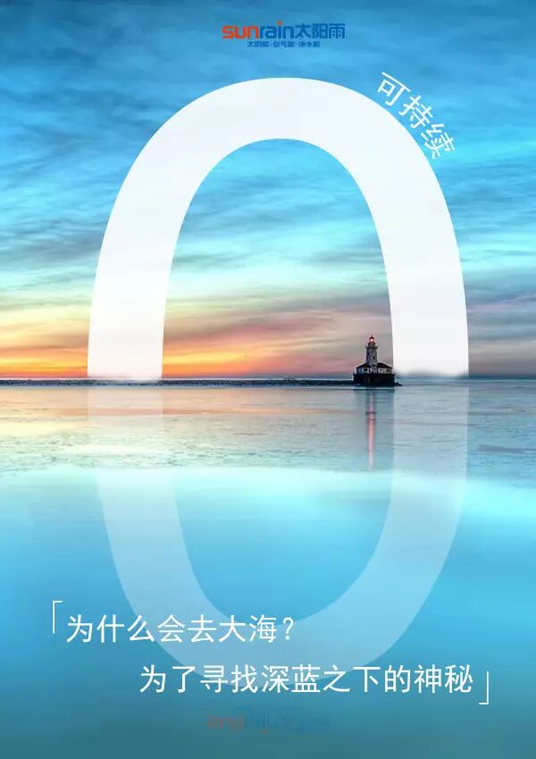 创意思想:太阳雨三个主题 可持续 零能耗 零排放 选了三个大自然的主题 第一个 大海的就是冰融水 水结冰 又有纯净的意思 代表可持续 第二个是荒漠的,因为荒漠植物,动物,较少所有叫零能耗 耗能量较少 第三个是丛林,因为深林环境很好,植物光合作用 ,呼吸作用 是循环的,也是比较清新的所以是零排放 做出一个系列作品,倡导一切绿色,低碳,环保的生态行为,来表达我们太阳雨的产品调性。