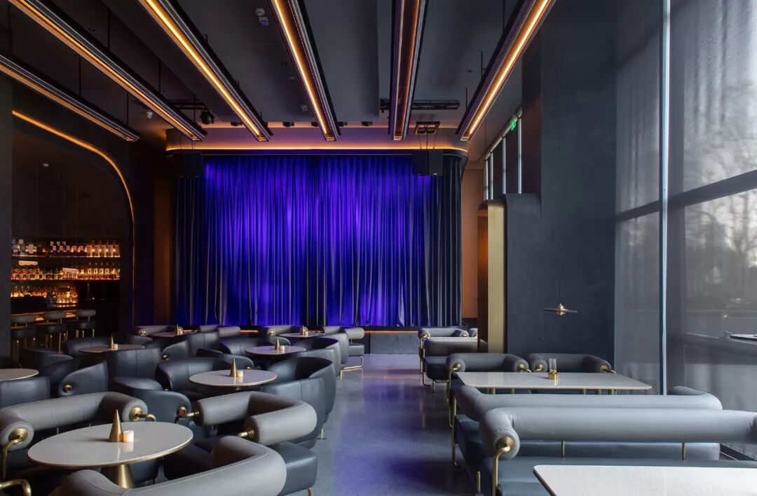 通过电动门便进入酒吧主体,卧于吊顶上的金属轨道灯引导视线.一幕深邃的蓝色幕布如果冻般凝固在舞台上。舞台对面的吸音墙,消解声音的同时又将体验者引入一条时光隧道,仿佛是自己过去和未来之间的对望。180度曲面环抱的酒墙,每一个面皆显温柔,伴随着2100度的色温,像一个点燃篝火堆的山口洞穴,温暖又具有归属感;悬垂的优福(UFO)吊灯,犹如生命中那个意外的惊喜,而这个意外在徒步旅行的路途中也具有一定的合理性。