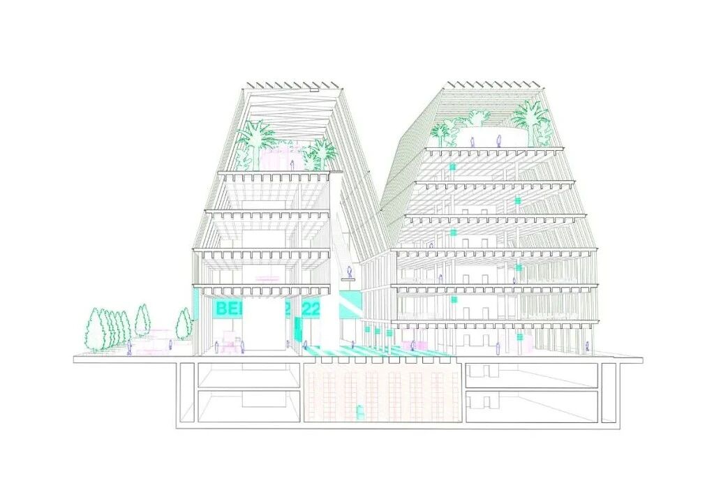 两个体块包裹在一个统一的金属和玻璃外表皮下,强调其标志性和统一性。同时该立面也可以根据不同的气候条件进行调节,以获取最佳光照和储存太阳能。