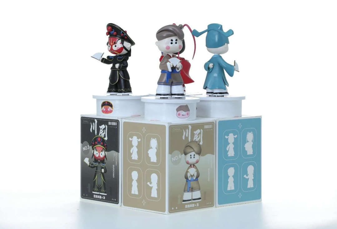 设计说明:这套盲盒以川剧生、旦、净、丑四个行当设计,外观造型呆萌可爱。赋予其按压人物头部发出人物代表川剧台词的互动设计,在用外观吸引人的同时,用互动的形式进一步加深人们对于川剧文化的了解。人物与底座通过磁感应供电,蓄电完成,拿去底座也可单独使用。底座上可以 DIY 贴纸,由人们手动的赋予他们不同的心情,提高互动性的同时进一步拉近与川剧的距离。