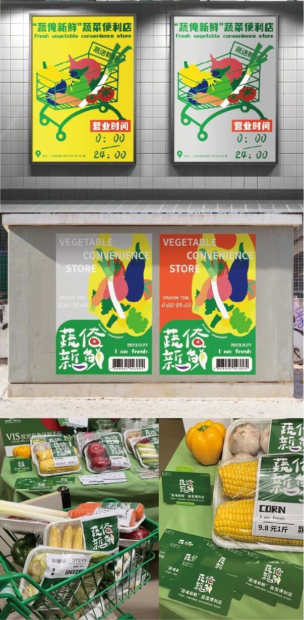 设计说明:“蔬俺新鲜”针对年轻消费群体对购买蔬菜的多样化需求提供的蔬菜便利店品牌。重新定义蔬菜便利店的品牌形象设计,用全局思维来设计一套有创意、有特点的蔬菜便利店品牌视觉形象。来展现蔬菜便利店独特的文化内涵,树立品牌形象。整体设计风格以简洁、清晰为直观的方式,来达成有效的视觉沟通和传播设计风格。传递健康新鲜的品牌定位。从视觉的角度出发满足品牌年轻乐活、新奇独特的调性。推广有机蔬菜,以色彩带动蔬菜故事性,引起年轻人重视的同时诱发对自己身休健康的思考,少吃外卖,多动手吃健康绿色蔬菜。尽可能的从平面的方向上展现蔬果品质感。