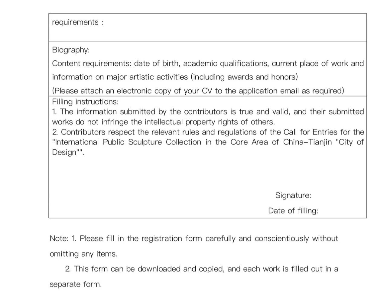 4. Proposal submission request: Online registration is available (if the author has network difficulties, please contact the organizing committee).Applicants need to fill in the application form (including author information, introduction, creative description, etc.) and sign for confirmation. Please send the electronic version of the registration form, photos of exhibition works scheme (from multiple angles), personal photos and scanned copies of ID card (front and back) to the following email: tjggds2023@163.com before 24:00(12:00A.M) August 26th, 2023.If multiple works are sent, the picture of the work should correspond to the description of the work clearly and clearly. Assembling work needs clear installation drawings. The electronic resolution of all images should be above 300DPI. The submitted design works shall be in JPG format. The submitted design works shall not contain the name of the author, the name of the unit and other similar information to ensure the openness, fairness and justice of the work evaluation. Otherwise, the work shall be deemed invalid. The title of the submission document shall be named according to the name of the author, the title of the work, the specification, and the format of the material (for example, Miron's "Discus Thrower" is 152cm high and bronze. JPG).Each artist can submit one or more projects, each project should be a separate folder, late submission of materials will not be accepted. It is recommended to compress and pack the work scheme and send it to the submission email, for example: Miron "Discus Thrower ".rar.